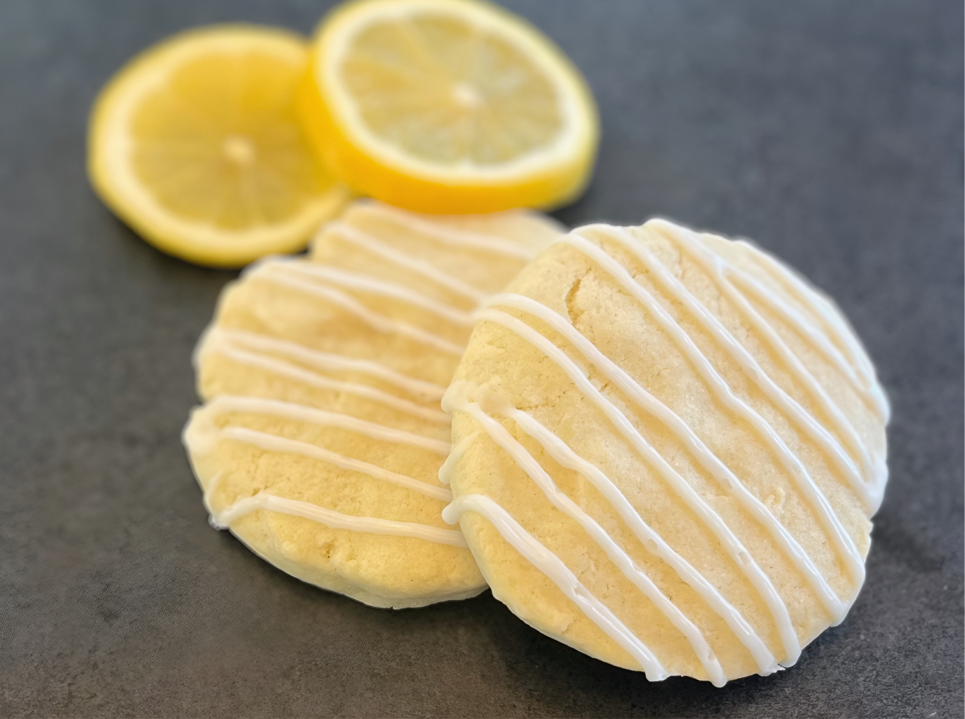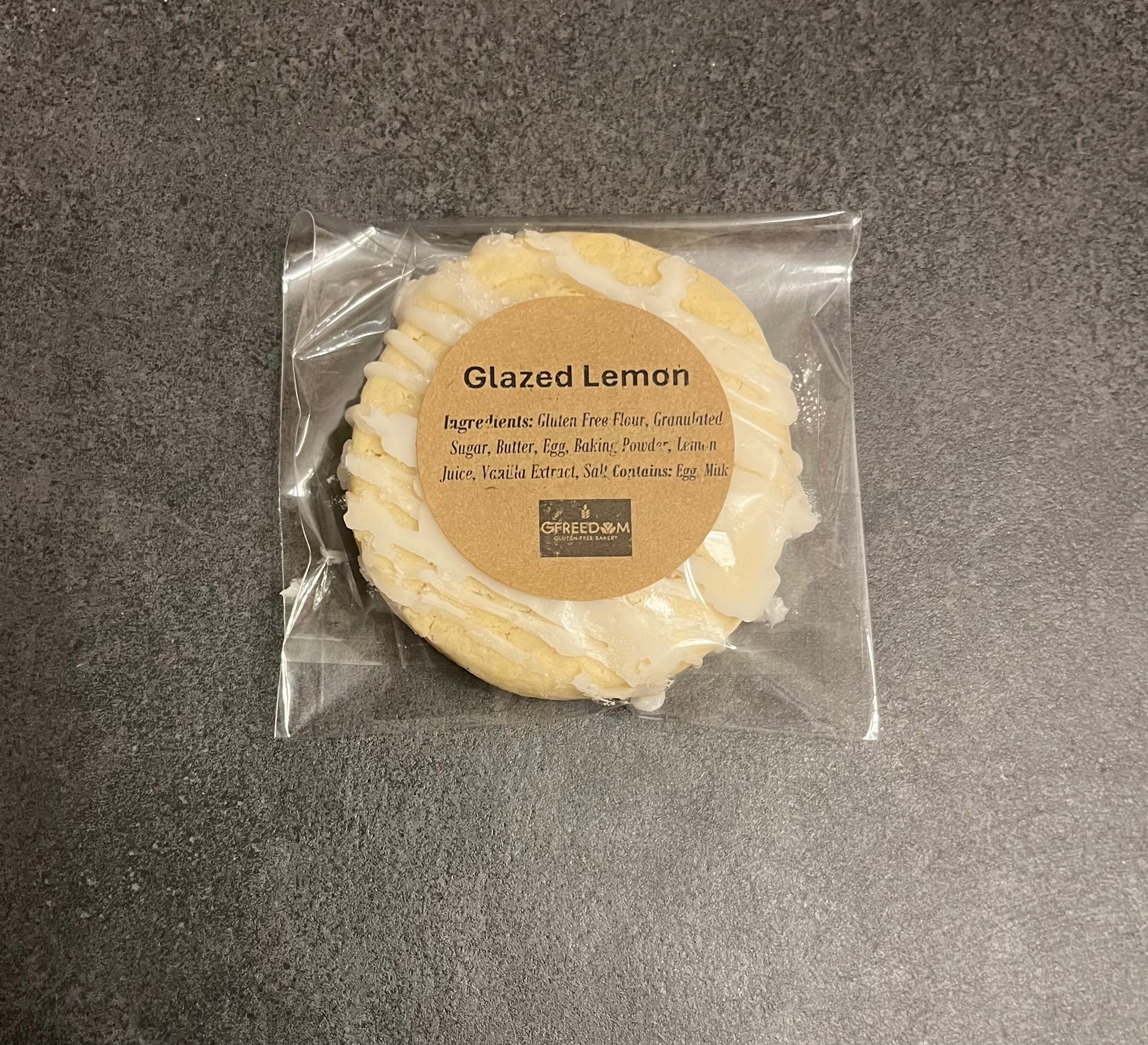 1 Dozen 1 oz Gluten Free Glazed Lemon Cookies (Approximately 2" Diameter) packaged individually.