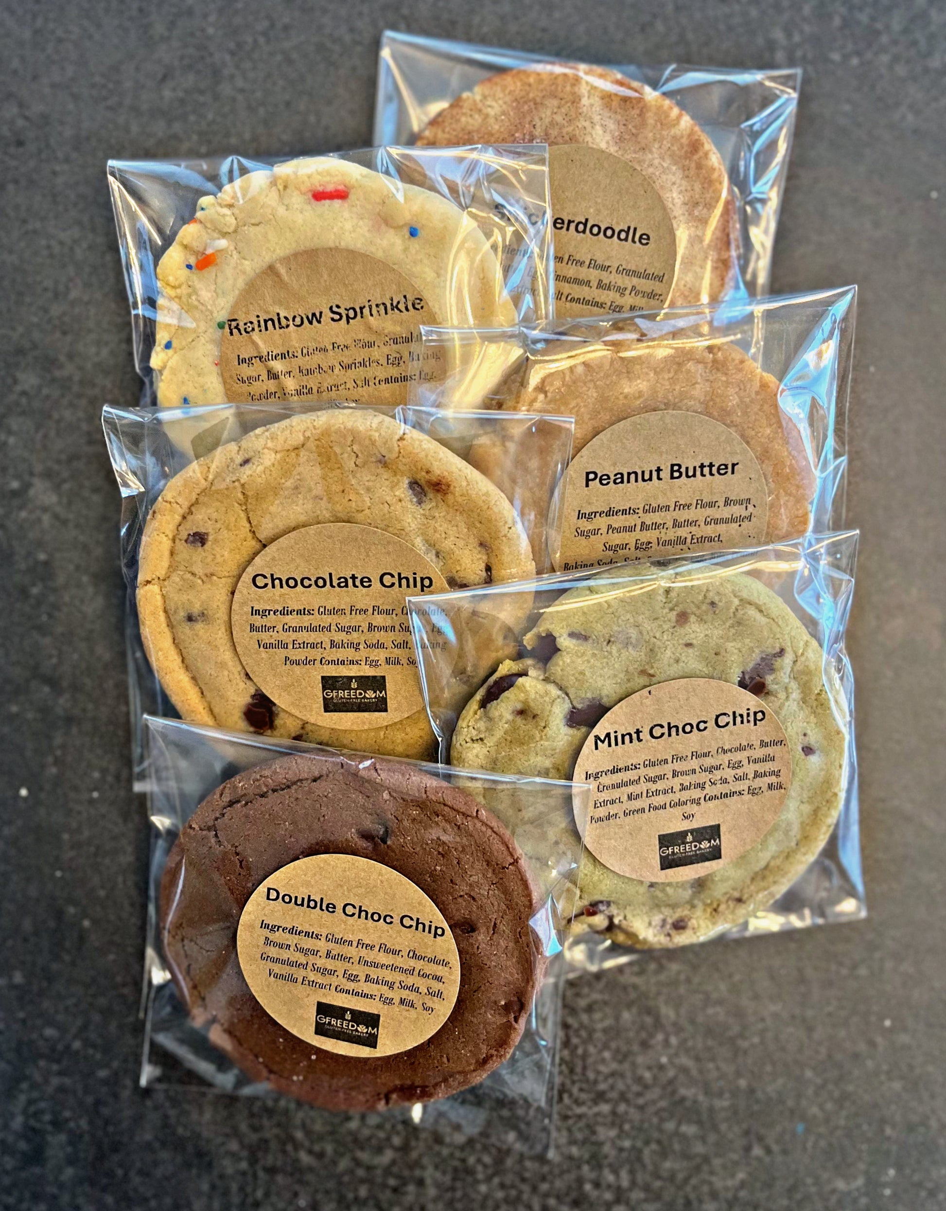 | 1 Dozen 2 oz Gluten Free Cookies (Approximately 3" Diameter) packaged individually. 2 of each: Chocolate Chip, Rainbow Sprinkle, Snickerdoodle, Peanut Butter, Mint Chocolate Chip, Double Chocolate Chunk. |